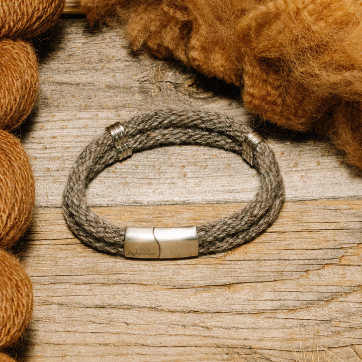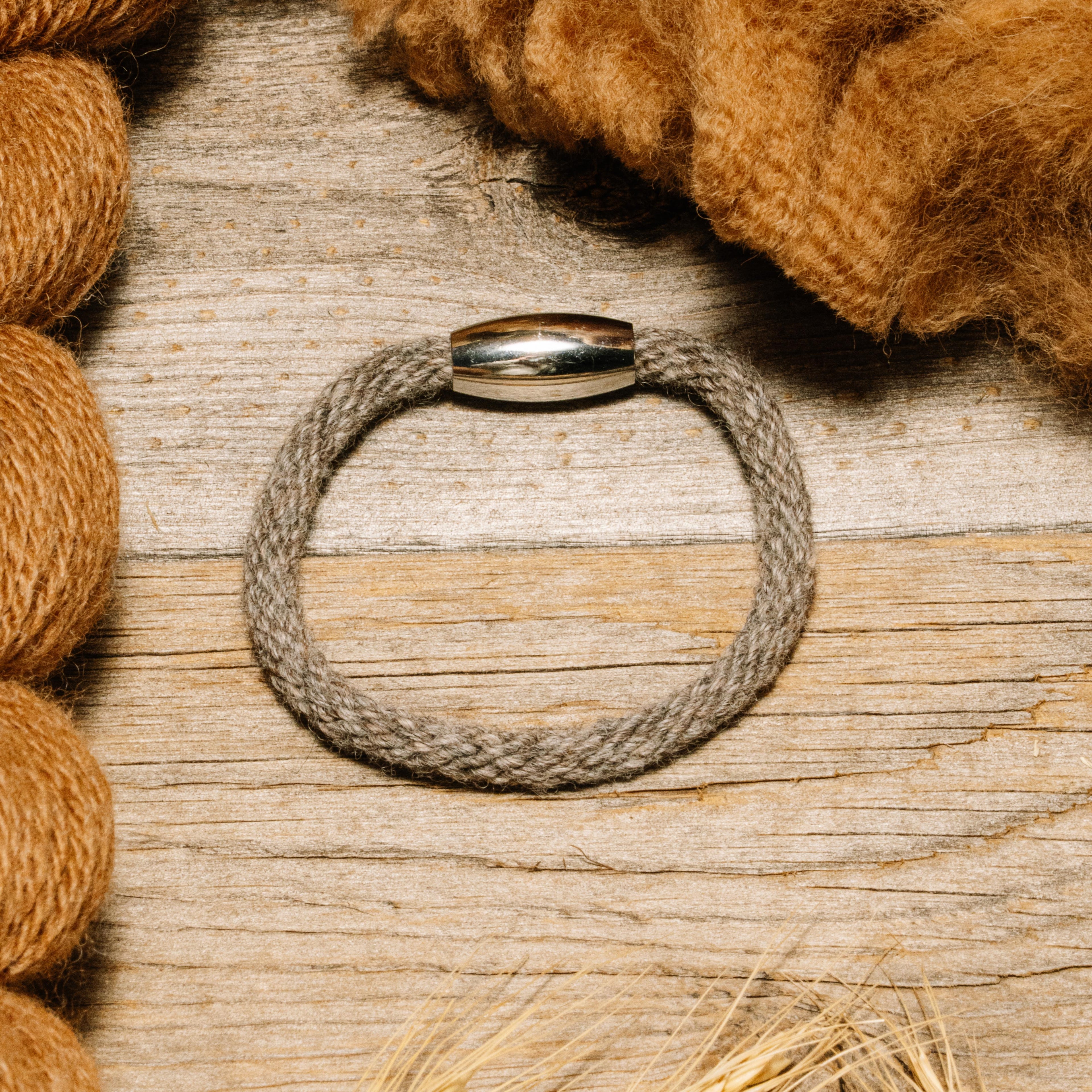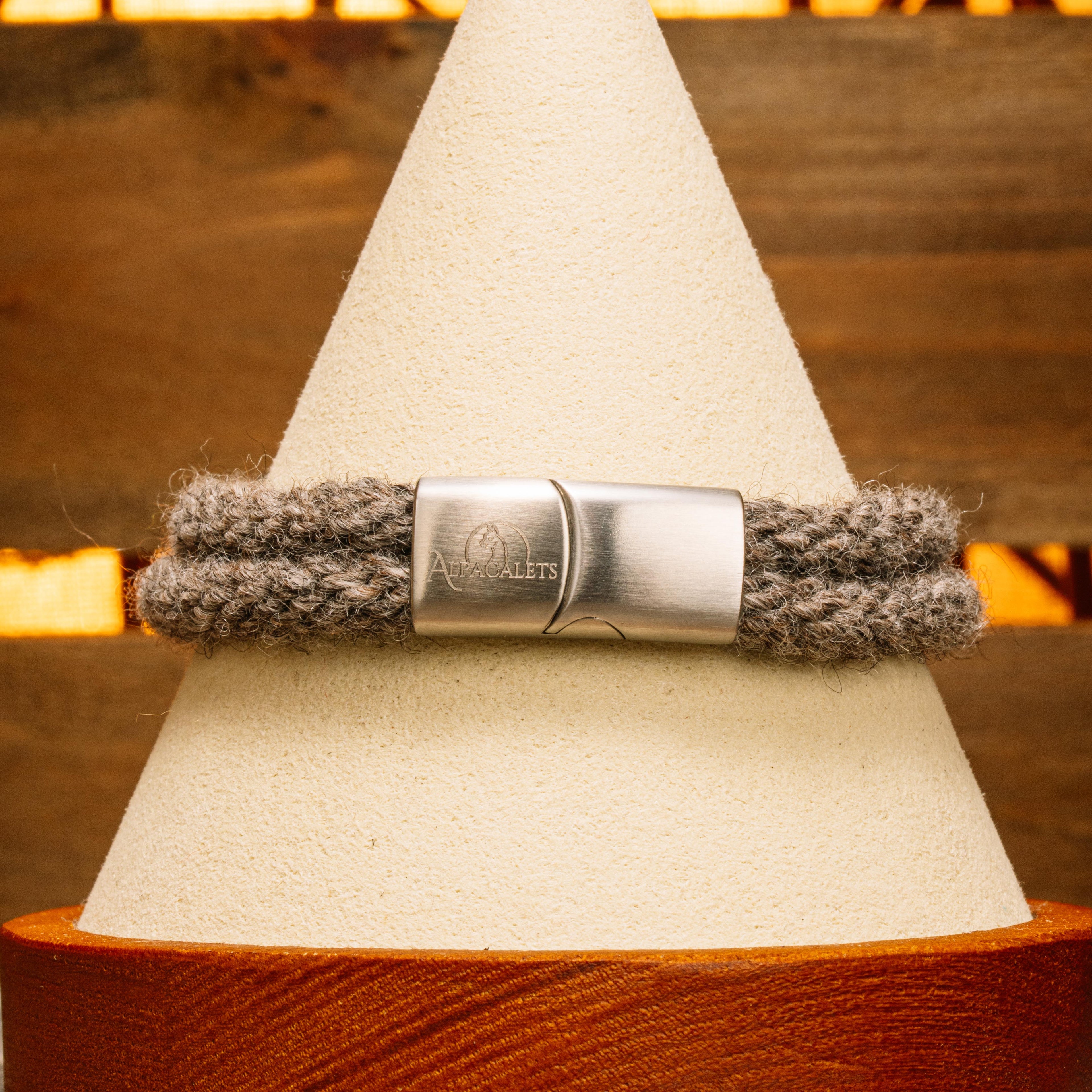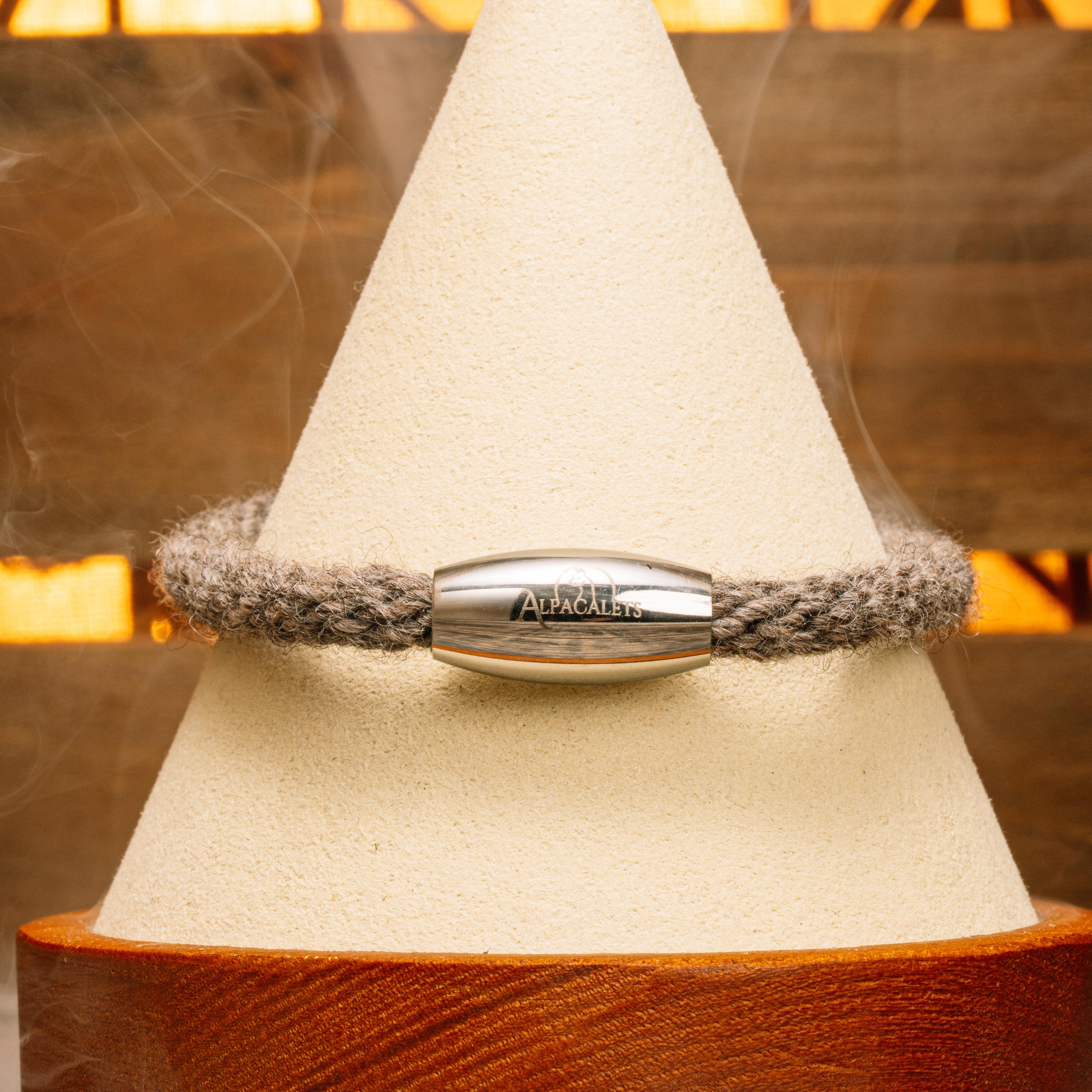 Braided from undyed medium gray alpaca fiber, this bracelet captures the quiet calm of worn barn wood and morning mist. Grounded and timeless.