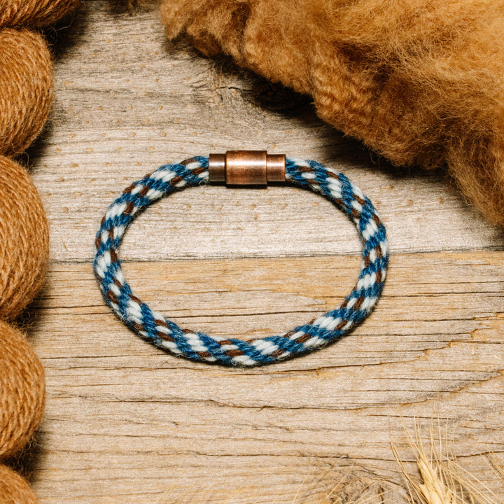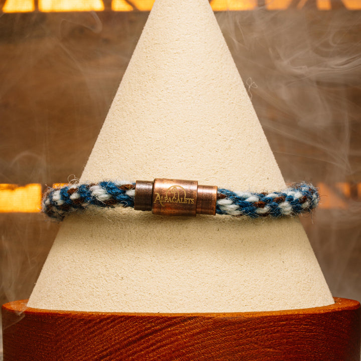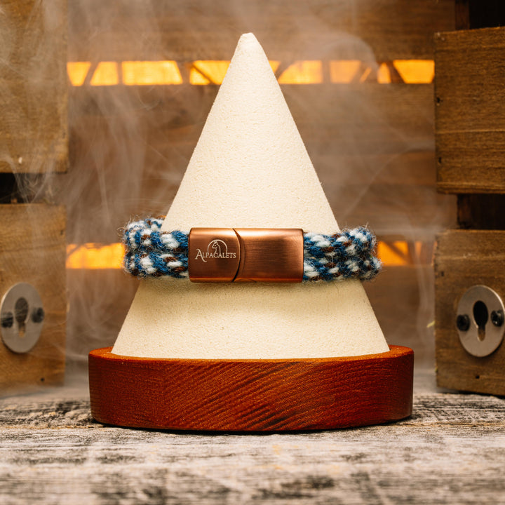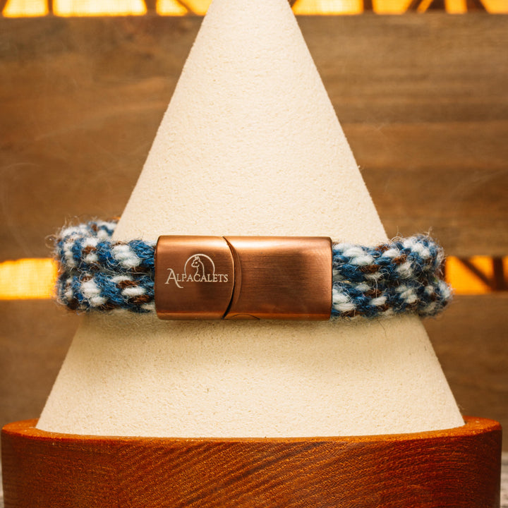 A refined blend of blue hues with bronze detail.